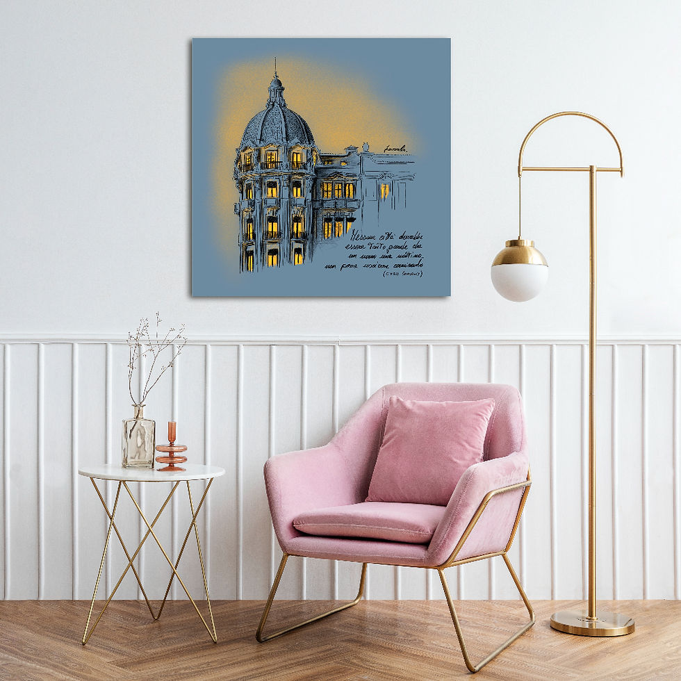 Stampa fineart su tela di altissima qualità, protetta da vernice finale, antigraffio, resistente alla luce, gancio a scomparsa.